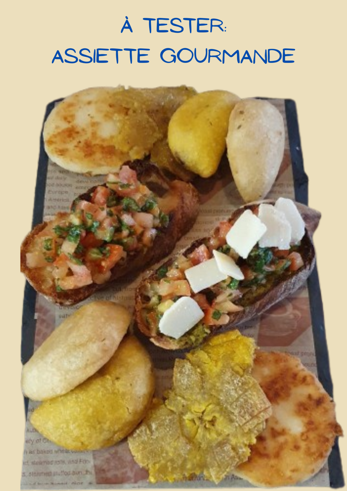 L'assiette gourmande, avec patacones, arepas con queso, empanadas et bruschettas