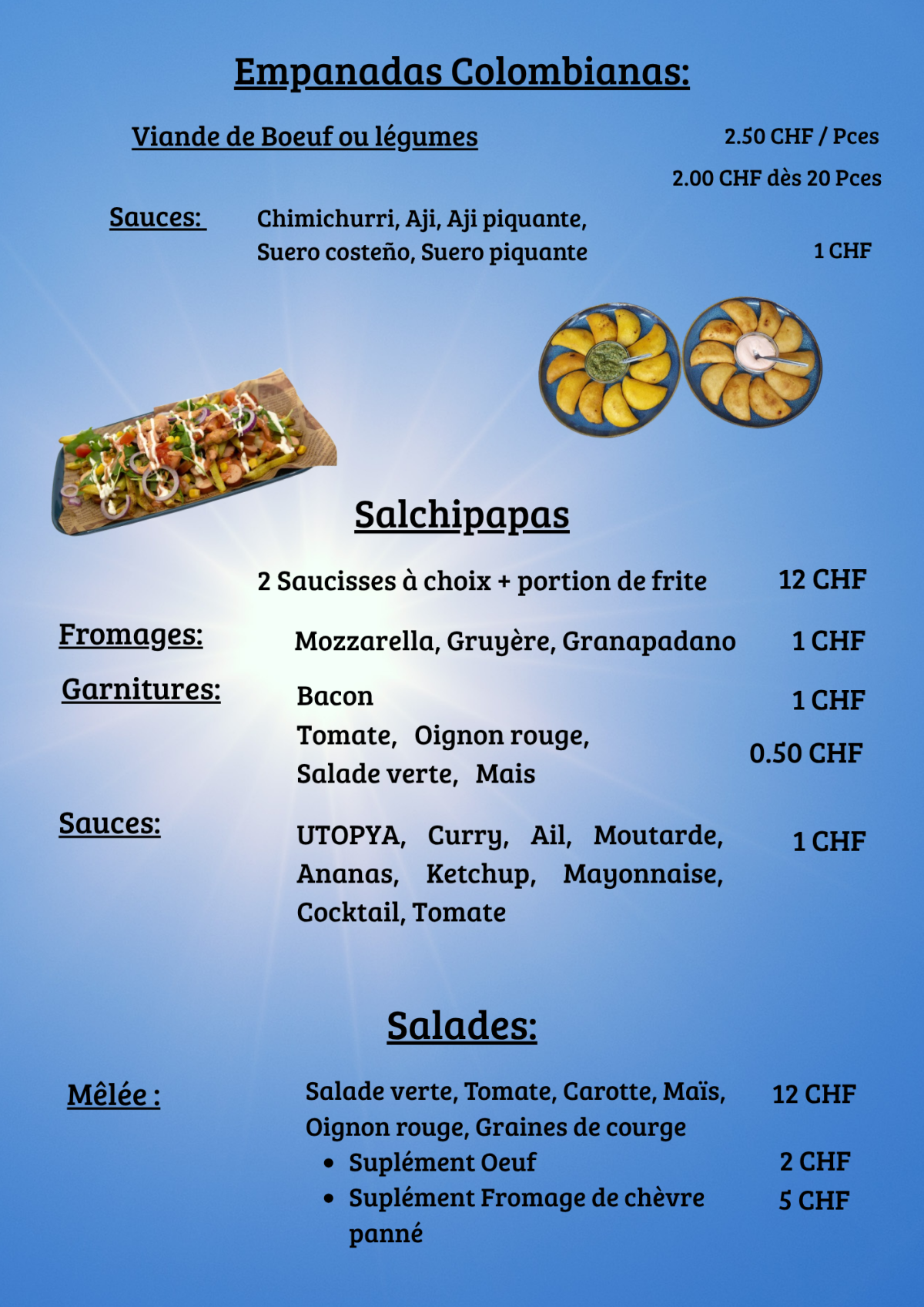 Nos plats inspirés de la street food colombienne se mangent tant bien à midi, à l'heure de l'apéro ou pourquoi pas à 1h du matin puisque la cuisine est ouverte non stop jusqu'à une heure de la fermeture.